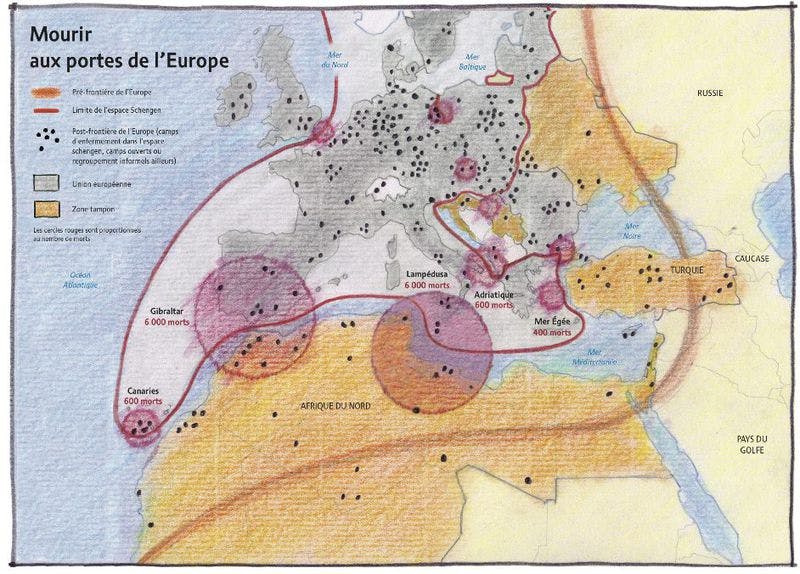 Sarah Mekdjian is Assistant professor in Geography at the University Grenoble Alpes and PACTE laboratory in Grenoble. She has a key interest in critical legal analysis and the counter-mapping of migration and border policies. Among others, together with Anne-Laure Amilhat Szary, Marie Moreau, Gladeema Nasruddin, she has been making experience-maps of migration routes (see Figure 57, above).